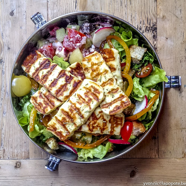 Salade toscane (Berloumi grillé, salade garnie, dernières tomates belges, croûtons à l'ail et vinaigrette balsamique)